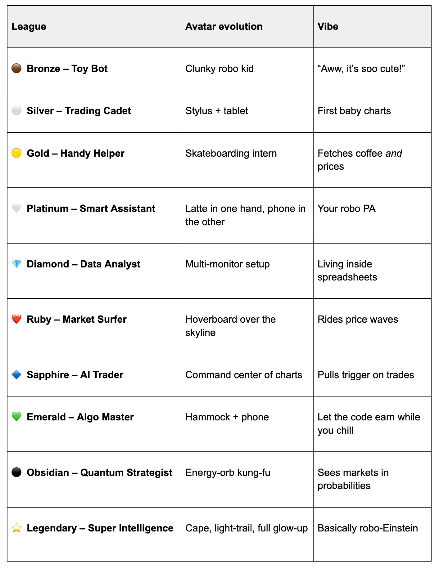 You unbox a knee-high robo-kid with a screen-for-a-face and just enough smarts to wave. Feed it ⚡ XP (earned from daily claims, missions, quests, trades, or referrals) and it morphs -- level by level -- into a market-crushing Super Intelligence.